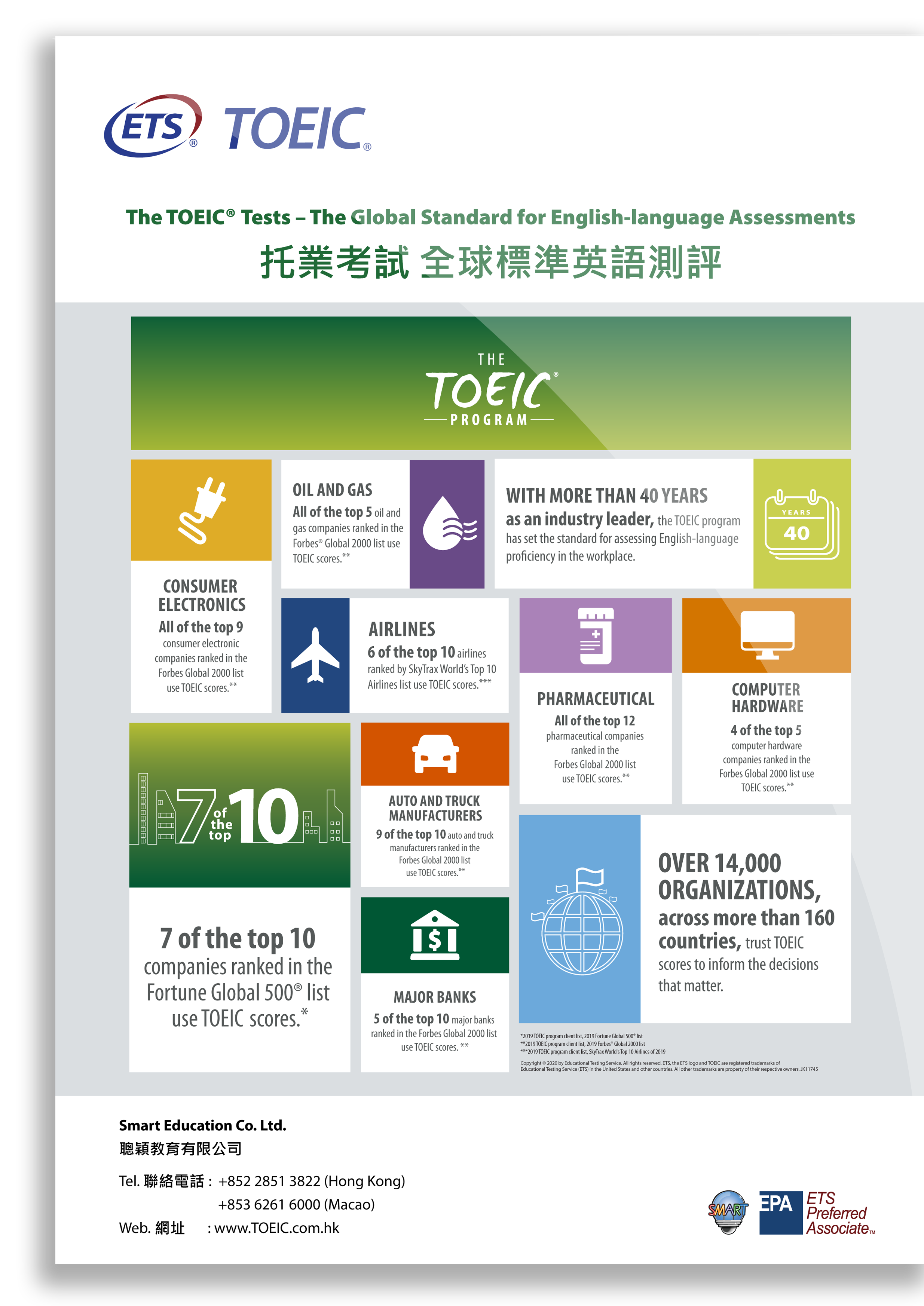 | 托業聽力與閱讀考試 | TOEIC® 口語考試 | TOEIC® 寫作考試 | |